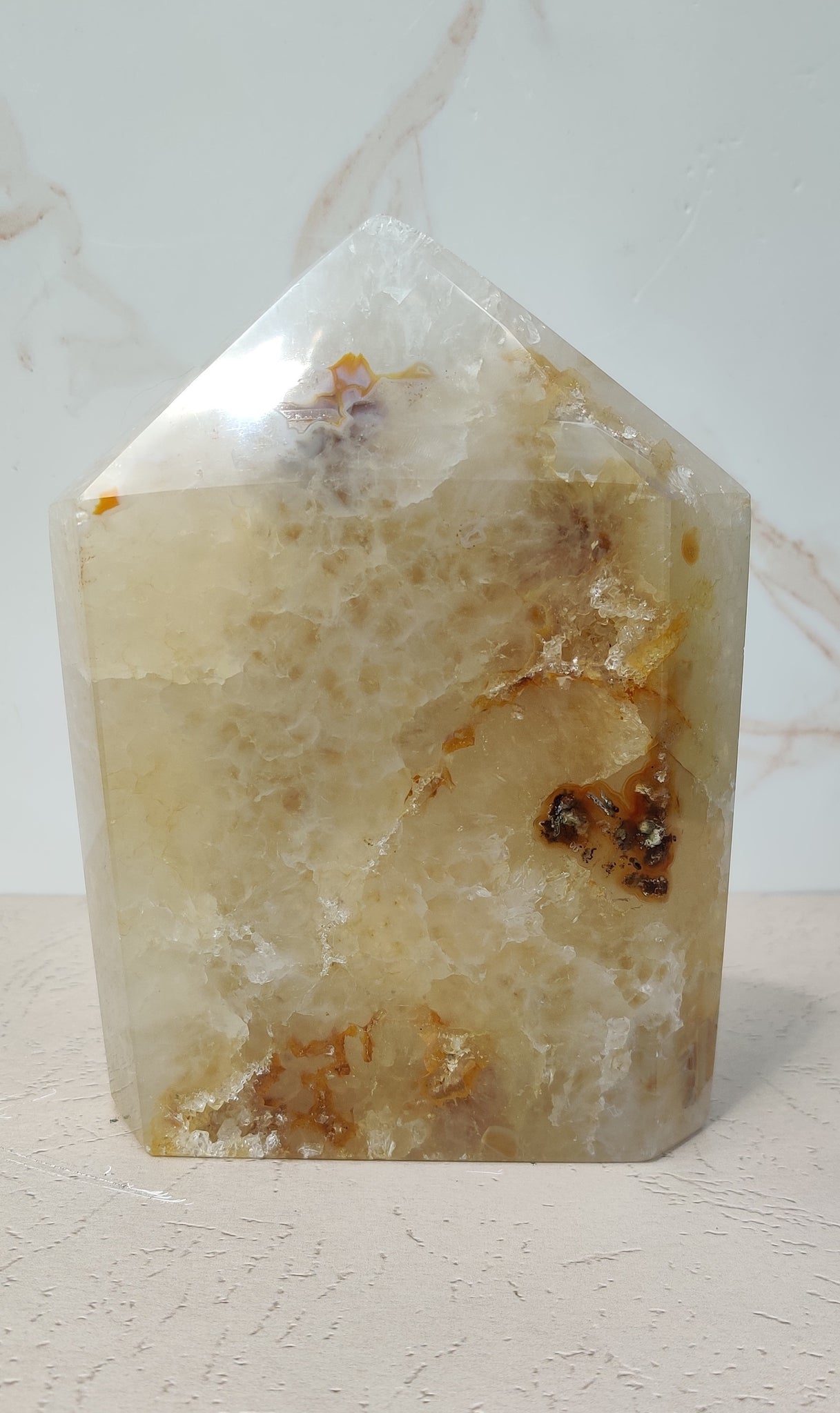 Agate instills security and safety. It cleanses and stabilises the aura, eliminating and transforming negativity. This beautiful statement piece will bring joy and good energy to your space. She would make a beautiful addition to a shelf, an office desk, dresser or night stand, or anywhere you would like to proudly display her.